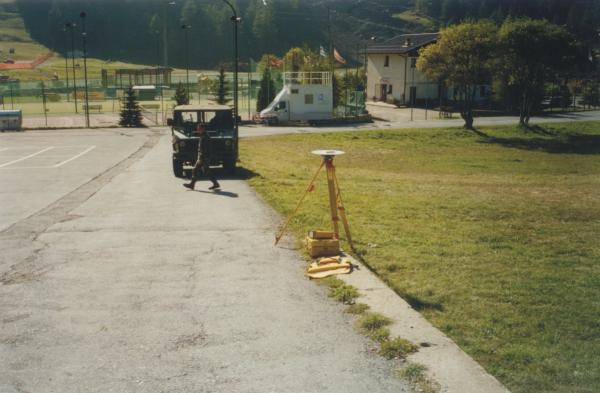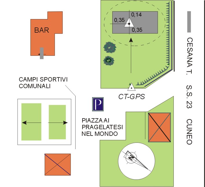 | materializzazione | Centrino in acciaio inox del tipo GPS da livellazione infisso alla sommità della testata del muro a retta, in cemento armato, della strada di accesso alla S.S n° 23 da piazza "ai Pragelatesi nel mondo" |