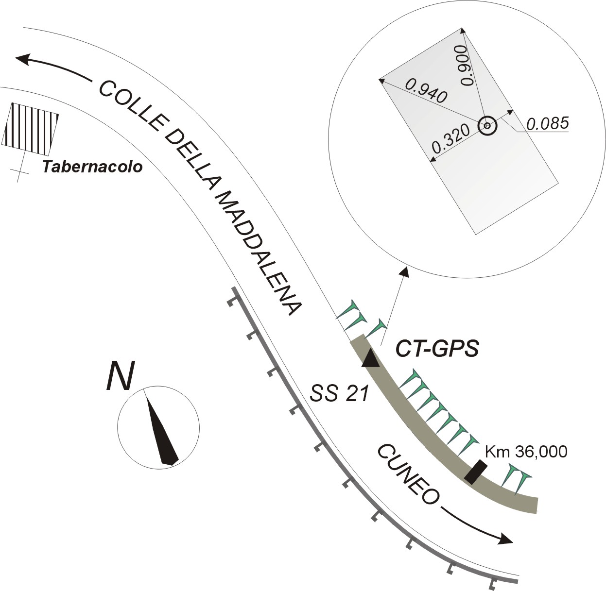 | Materializzazione | Centrino del tipo GPS dal ivellazione infisso sulla sommità del muro di sostegno a monte della S.S 21, presso la testata verso il Colle della Maddalena. |