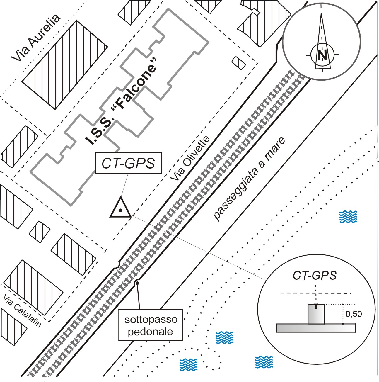 | Materializzazione | Centrino in acciaio inox del tipo "GPS C" infisso sulla sommità di un pilastrino in cemento posto nel posteggio dell' Istituto Secondario Superiore "Falcone". |