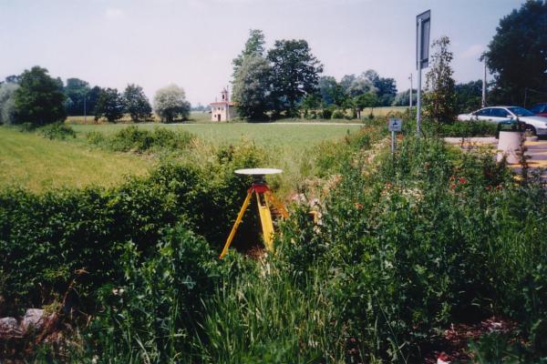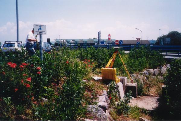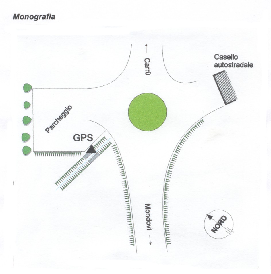| materializzazione | Centrino in acciaio inox del tipo GPS da livellazione infisso sul muro in calcestruzzo dell' opera di chiusa della canaletta di scolo delle acque piovane che costeggia il parcheggio antistante il casello autostradale di Mondovi'. |