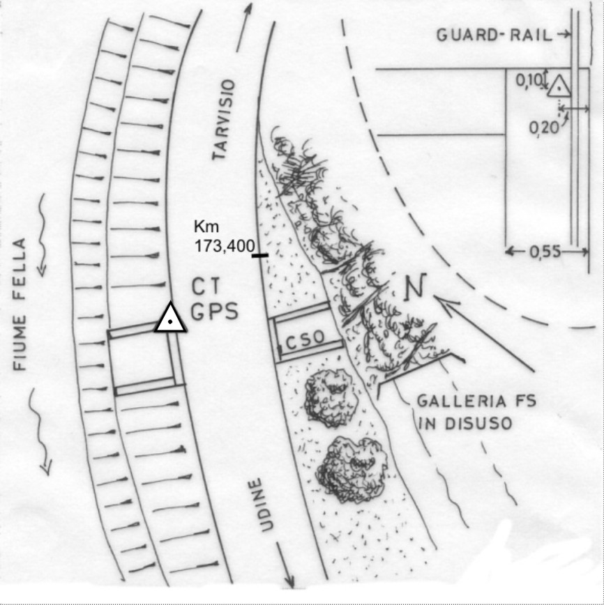 Centrino in acciaio inox del tipo "GPS da livellazione" infisso sulla soletta in cemento armato del chiavicotto a bordo della S.S. 13 nei pressi del Km 173,400 .