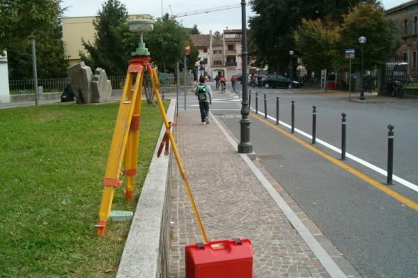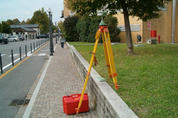 Centrino in acciaio inox del tipo "GPS D" infisso nel cordolo in cemento armato delimitante l'aiuola in Piazza Zotti.