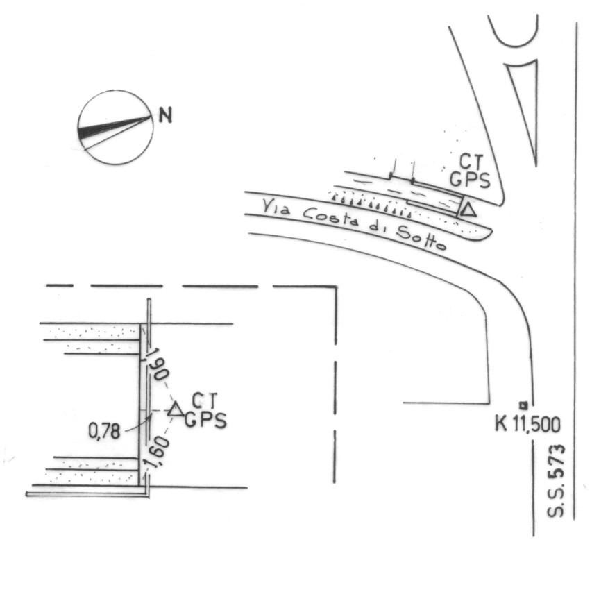 | materializzazione | Centrino del tipo "GPS C" fissato a livello suolo sulla copertura in cemento del canale parallelo a Via Costa di Sotto. |