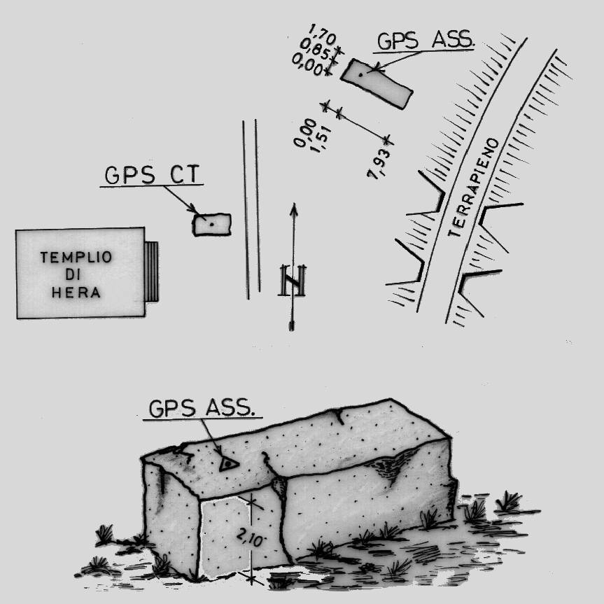 | materializzazione | Centrino di tipo "GPS D" fissato su grosso macigno a forma parallelopipeda collocato come da pianta in prossimità dei templi, sotto il terrapieno. |