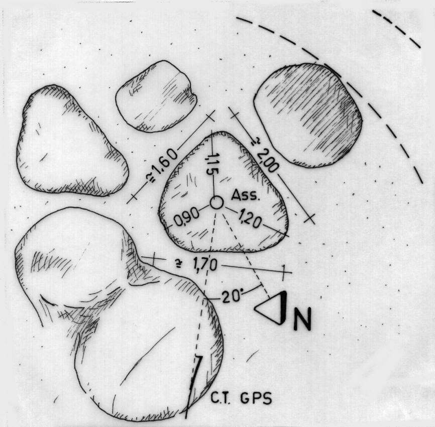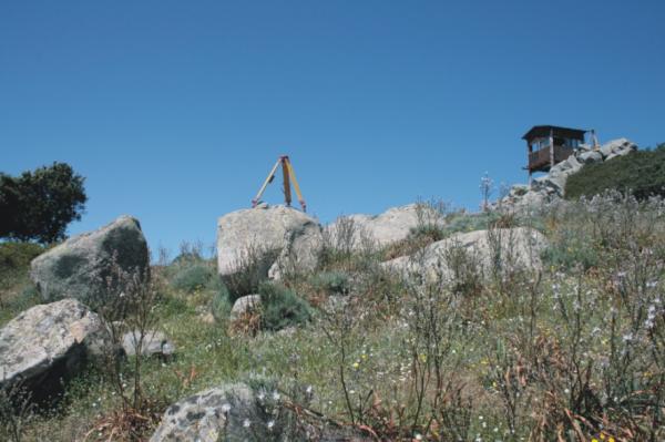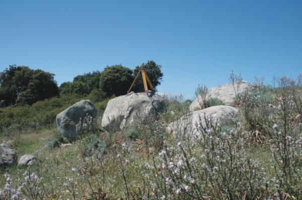 | materializzazione | Centrino di tipo "GPS D" fissato su un masso granitico dalla forma grossolanamente simile a quella di un triangolo sferico. ( Il punto è a sud – ovest del CT – GPS ed a circa 30 metri dallo stesso e il masso è alto circa 1,60 metri dal suolo). |