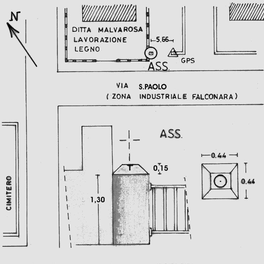 | materializzazione | Centrino di tipo "GPS D" infisso sul pilastro sinistro, in cemento armato, del cancello di accesso al campo a lato della Ditta Malvarosa Lavorazione Legno, in Via S.Paolo (Zona industriale). |
