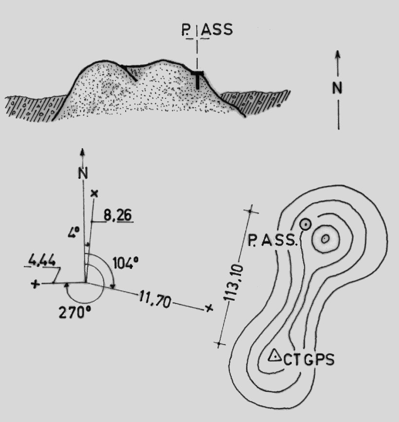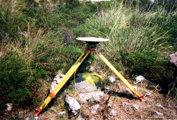 Centrino di tipo "GPS D" fissato su una roccia affiorante dal terreno, posta nei pressi della cima nord del monte omonimo, a 113,10 metri direzione nord dal punto GPS.