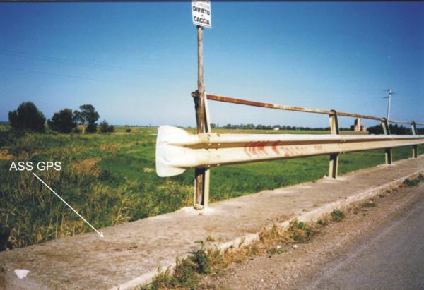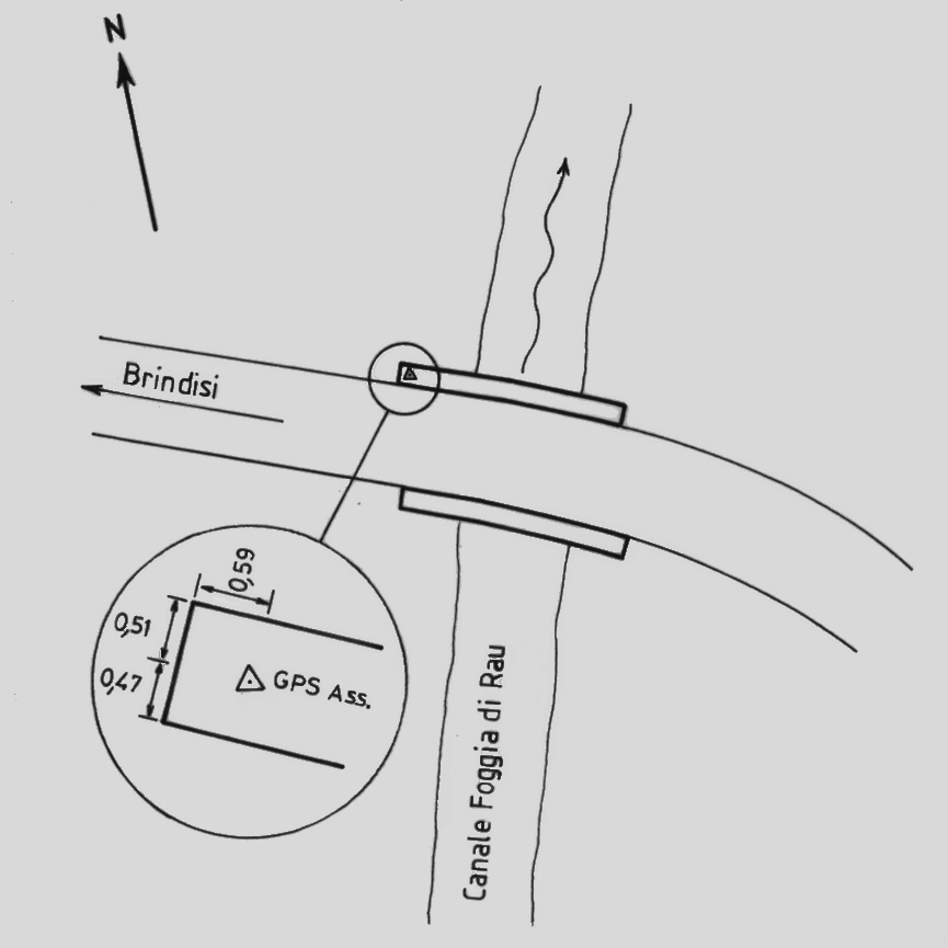 Centrino di tipo "GPS D" fissato sul margine ovest della spalla a valle, riva sinistra, del ponte sul canale Foggia di Rau, 700 metri circa ad est del grande edificio del telegoniometro della Marina Militare, ora in disuso.