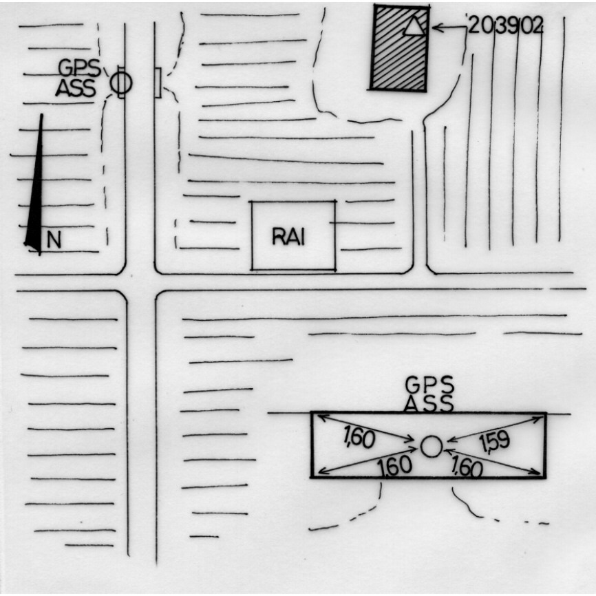 | materializzazione | Centrino del tipo "GPS D" fissato sulla spalletta del piccolo ponticello ad ovest sulla strada comunale che porta alla pista FIAT, a circa 500 metri ad ovest del CT GPS. |