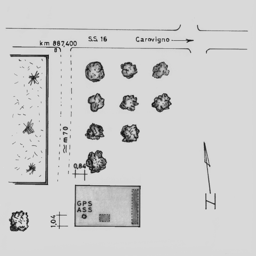 | materializzazione | Centrino del tipo "GPS D" infisso sulla soletta del serbatoio interrato in cemento sito a sud della S.S. 16 all'altezza del km 887,400. |