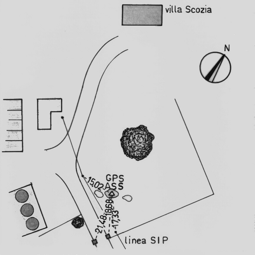 | materializzazione | Centrino di tipo "GPS D" infisso su roccia affiorante nei pressi del cancello di accesso alle abitazioni rurali di Villa Scozia. |