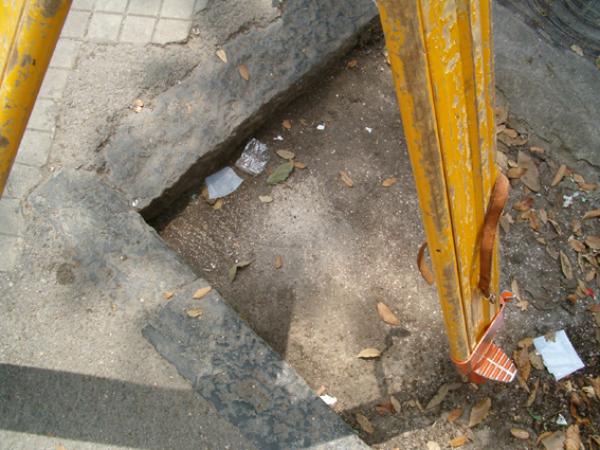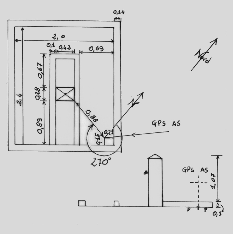 | materializzazione | Gambo del centrino GPS fissato nella pavimentazione di cemento, circondata da un cordolo di pietra, retrostante la fontana. |