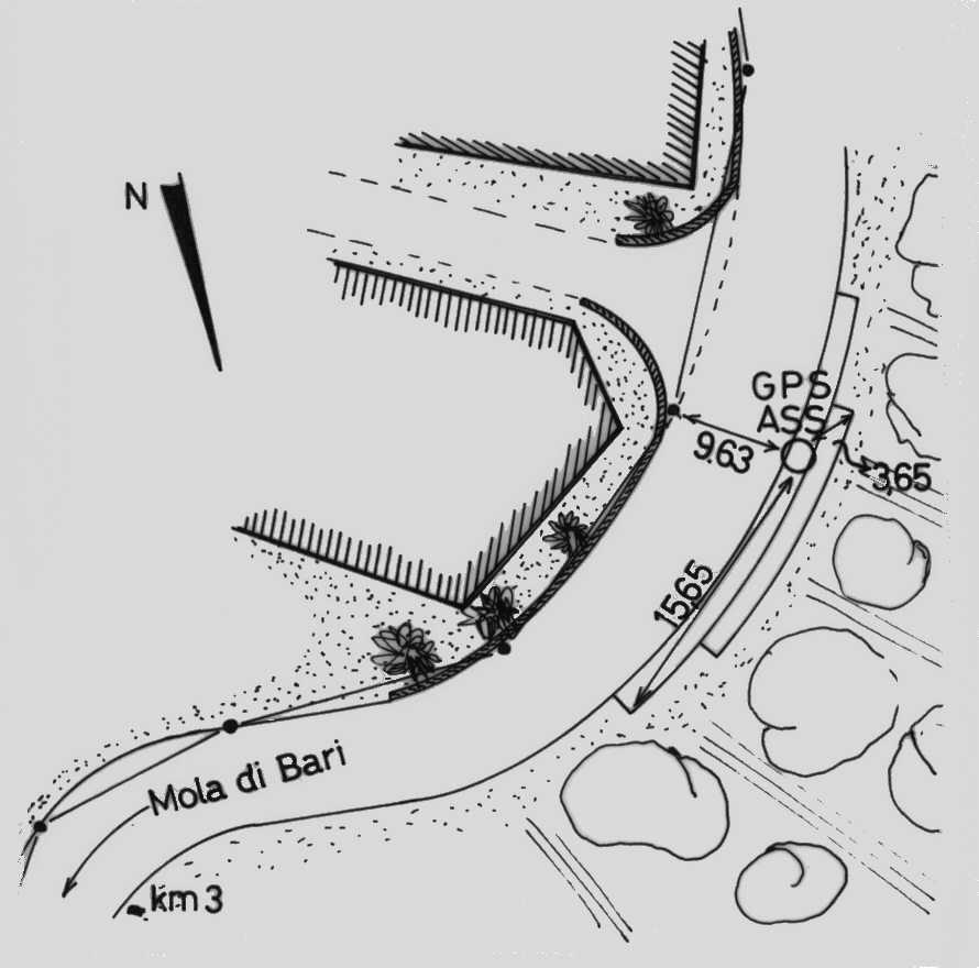 | materializzazione | Centrino del tipo "GPS C" fissato sul muro in cemento a sostegno della strada che congiunge Mola di Bari a Rutignano. |