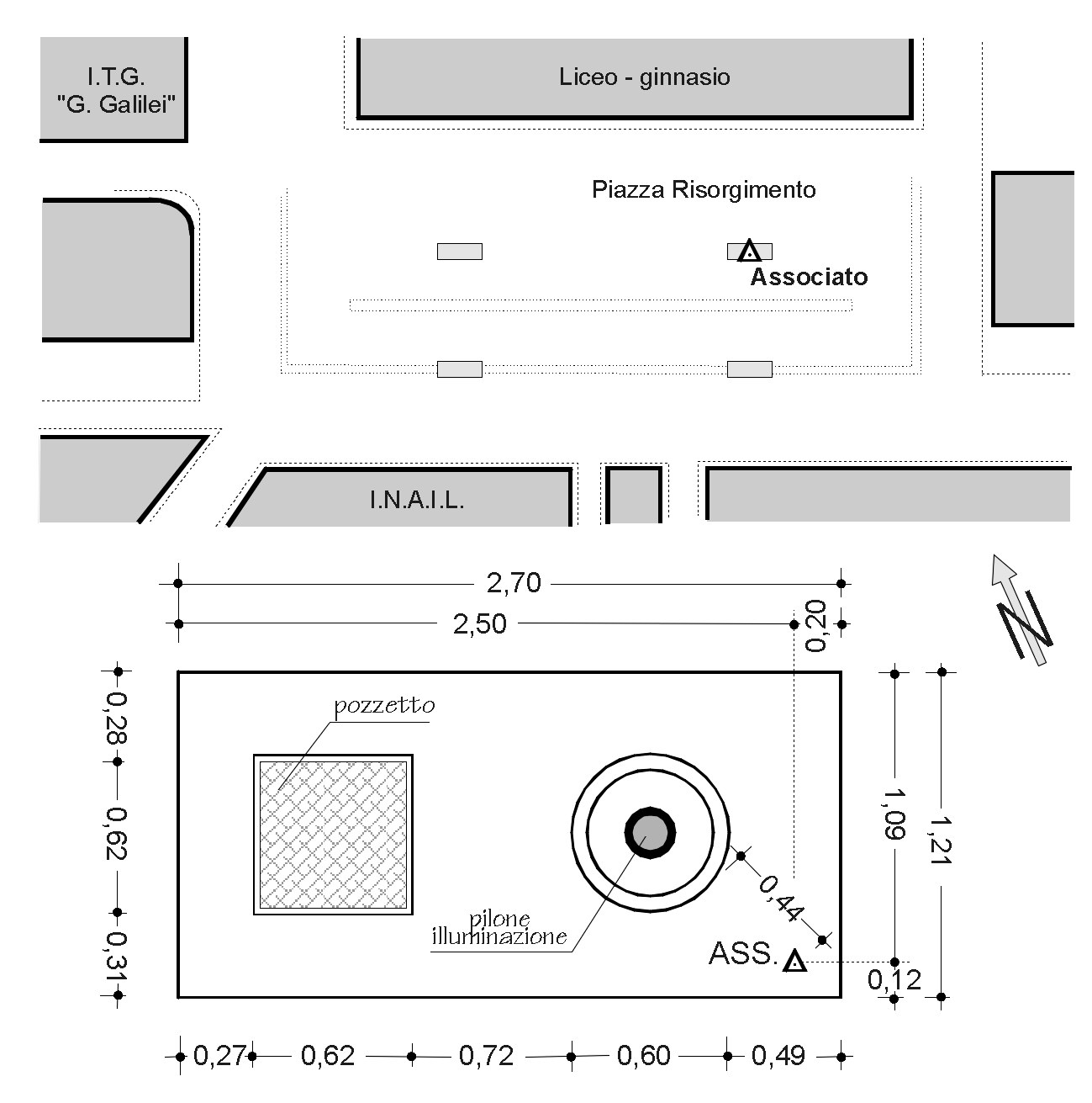 | materializzazione | Centrino in acciaio inox del tipo "GPS D" infisso nella piattaforma in calcestruzzo alla base del pilone centrale dell'illuminazione pubblica ubicato ad est nella Piazza Risorgimento. |