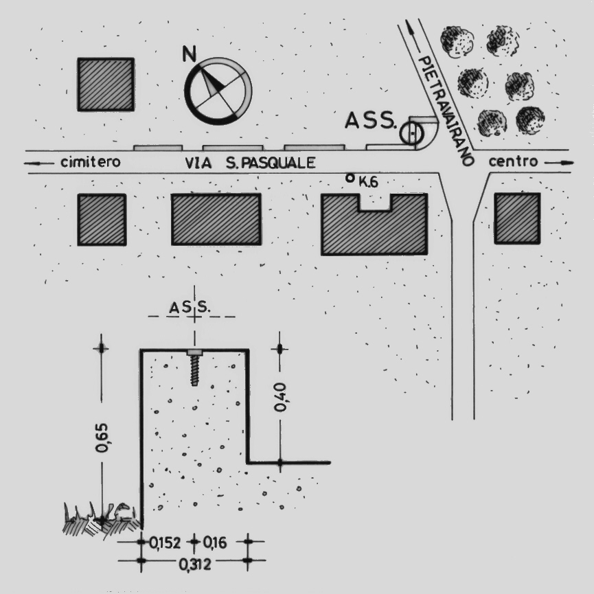 | materializzazione | Centrino del tipo "GPS D" fissato alla sommità del muretto in cemento armato sito in Via S.Pasquale (lato nord) in corrispondenza del bivio per Pietravairano. |