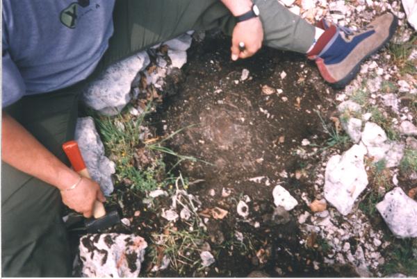 | materializzazione | Croce incisa sul cemento, a lato del centrino di superficie. |