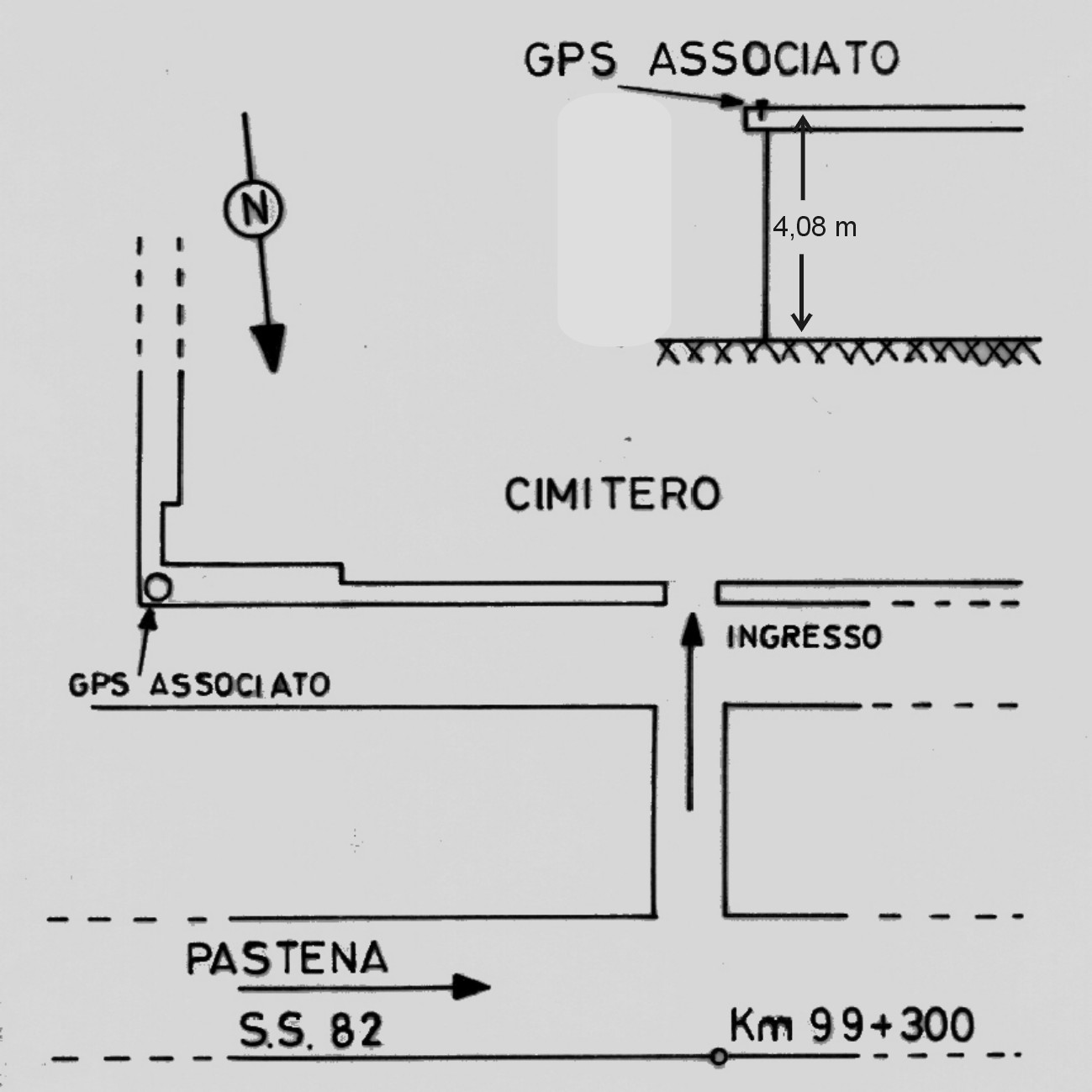 | materializzazione | Centrino di tipo "GPS D" fissato sulla copertura in cemento dello spigolo nord-est della facciata del cimitero. |