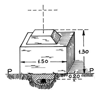 Segnale sul monte. Centrino metallico cementato su pietra interrata di 20 cm. e sovrastante blocco di pietre disposte a forma cubica.