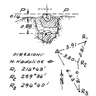 Segnale sul monte. Centrini tronco-conici di superficie e di fondo; il primo fissato in blocco di calcestruzzo cementato su grossa pietra, il secondo cementato in una pietra interrata rozzamente parallelepipeda. Riferimenti:Tre centrini cementati su roccie affioranti.