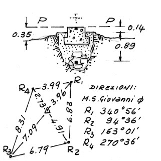 | Materializzazione | Segnale al centro dei resti di un basamento portabandiera. Centrini di superficiee di fondo. Riferimenti: Tre centrini fissati su pilastrini di cemento seminterrati. |