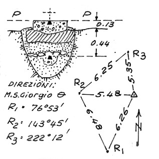 | Materializzazione | Segnale su di un costone a lieve pendio. Centrini troncoconici di fondo e di superficie; quest'ultimo cementato su di un masso di forma rozzamente prismatica. Riferimenti:Tre centrini cementati su rocce affioranti. |