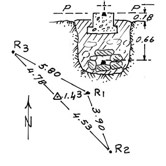 | Materializzazione | Segnale sul monte. Centrini di superficie e di fondo; quest'ultimo fissato a sassi cementati tra di loro. Riferimenti: tre centrini cementati a massi di roccia affiorante. |
