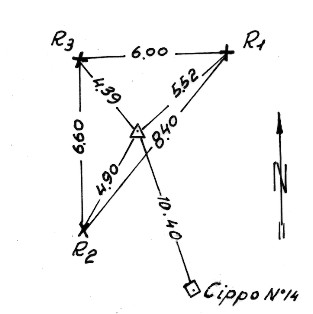| Materializzazione | Segnale circa 10 metri a Nord del cippo n. 14. Centrino incastonato su roccia. Riferimenti:come da pianta. |