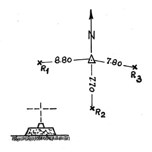 | Materializzazione | Segnale sulla quota più alta del Monte Buffalora ad Ovest del cippo 9. Centrino di zinco cementato su pietra che sporge dal terreno 20 cm. Riferimenti: 3 croci incise come da pianta. |
