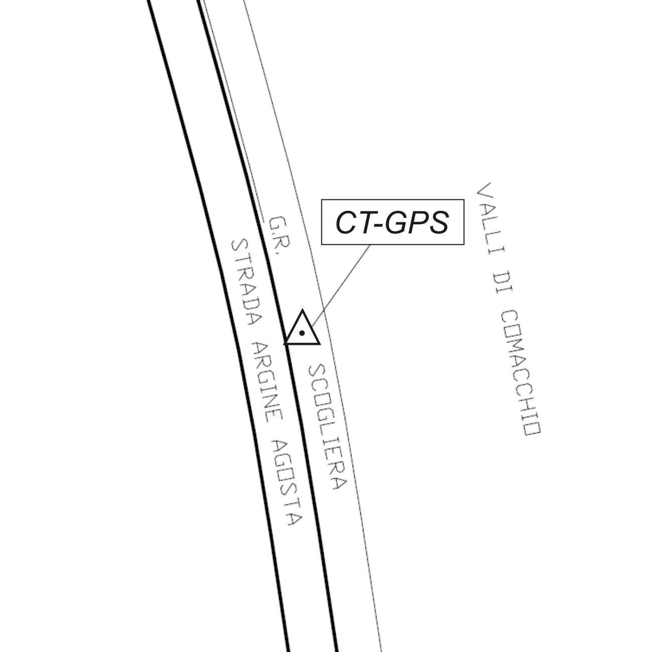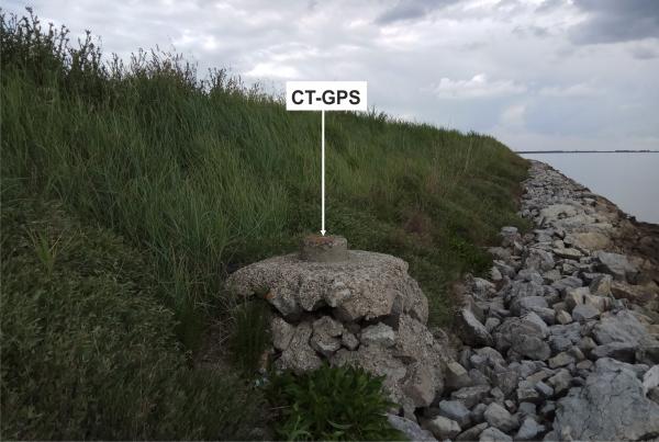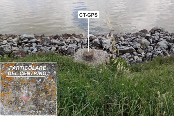 Borchia metallica infissa su basamento in cemento alla base dell'argine, lungo l'Argine Agosta.
