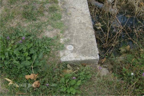 Centrino metallico infisso in corrispondenza dello spigolo della spalletta del piccolo tombino posto in prossimità del civico 1 di Via San Lazzaro nella periferia di Argenta.