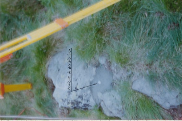 | Materializzazione | Segnale posto al centro del crinale a Sud del P. zo Camino a quota 1875, costituito da un chiodo in acciaio inox cementato su roccia. Riferimenti: croci incise R1, R2, R3; T incisa R4. GPS |