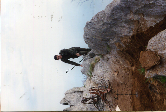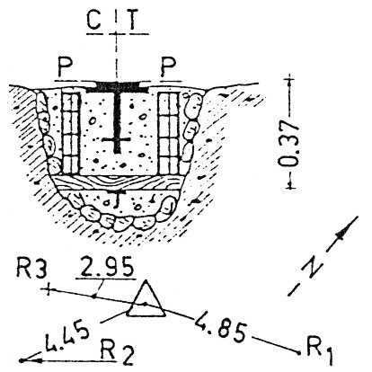 Segnale al centro della lama rocciosa della cresta della Ceresa, costituito da centrino di superficie e sottostante centrino di fondo coassialmente cementati in blocchi di calcestruzzo indipendenti. Riferimenti: centrini metallici R1 e R2, croce incisa R3. GPS
