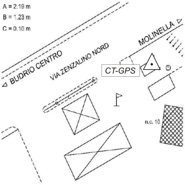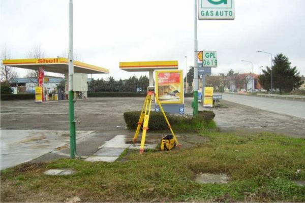 Centrino metallico infisso sullo spigolo nord di una piattaforma in cemento, la più piccola delle due, all'interno dell'area di servizio di un distributore in Via Zendalino Nord, nelle vicinanze dell'omonima area industriale.
