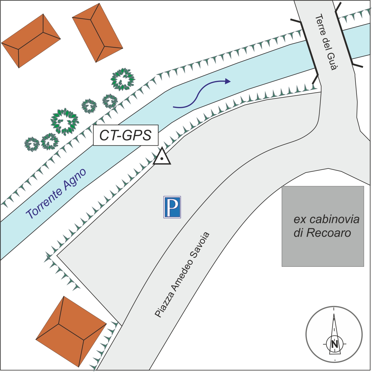 Chiodo anonimo infisso nel cordolo in cemento, protetto da coperchio in ghisa quadrato, che si trova tra il torrente Agno ed il parcheggio Piazza Amedeo di Savoia in prossimità dell'ex cabinovia di Recoaro.