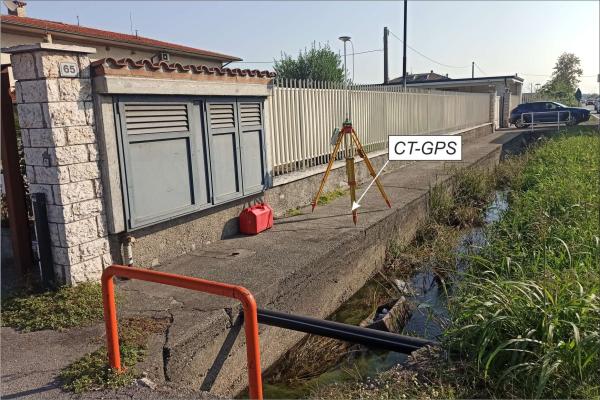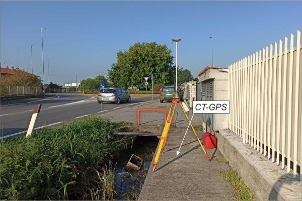 Centrino in acciaio inox di tipo universale, infisso sul marciapiede in cemento che divide la canaletta dalle abitazioni, lato destro del cancello d'ingresso dell'attività "Logic Trucks", al civico 65.