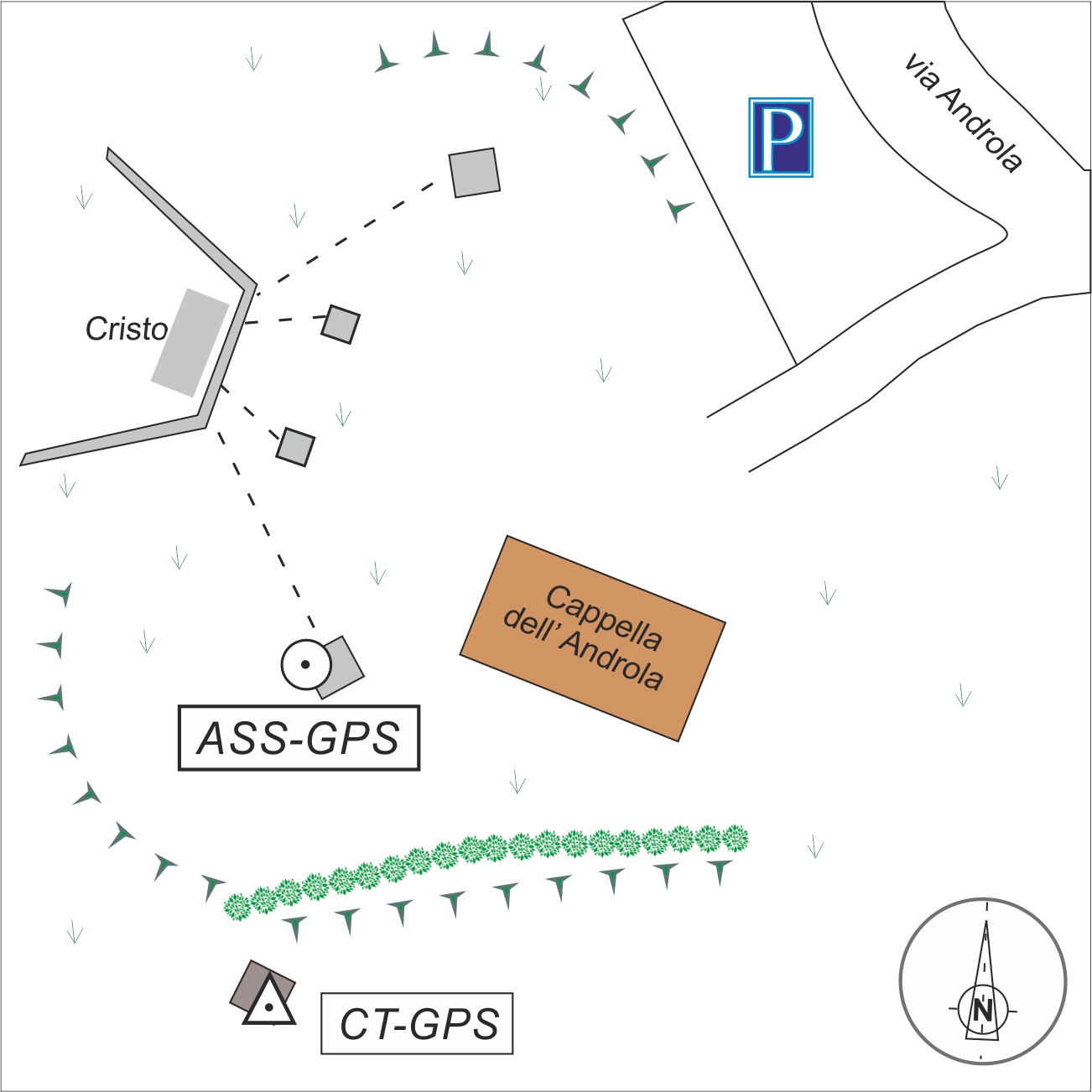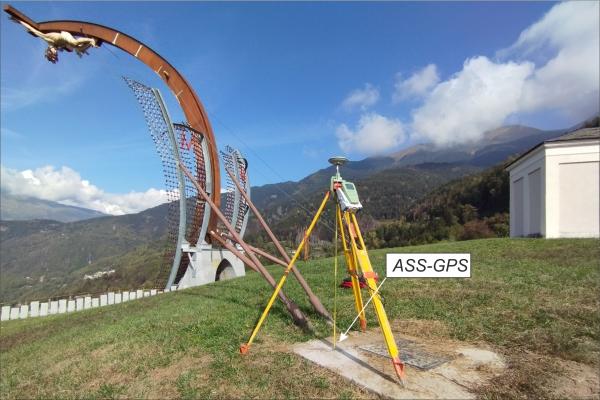 | materializzazione | Centrino in acciaio inox del tipo "GPS D", materializzato nella base di ancoraggio in cemento di un tirante del supporto del Cristo |