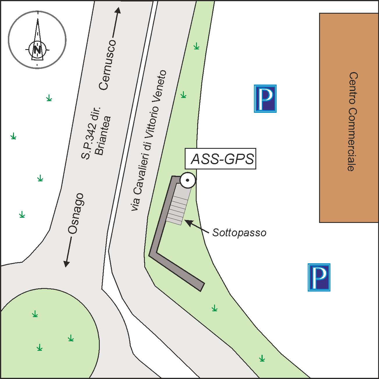 | materializzazione | Centrino GPS di tipo "D", infisso sul muro di contenimento della scalinata che collega il parcheggio del centro commerciale al sottopasso della S.P.432 dir Briantea. |