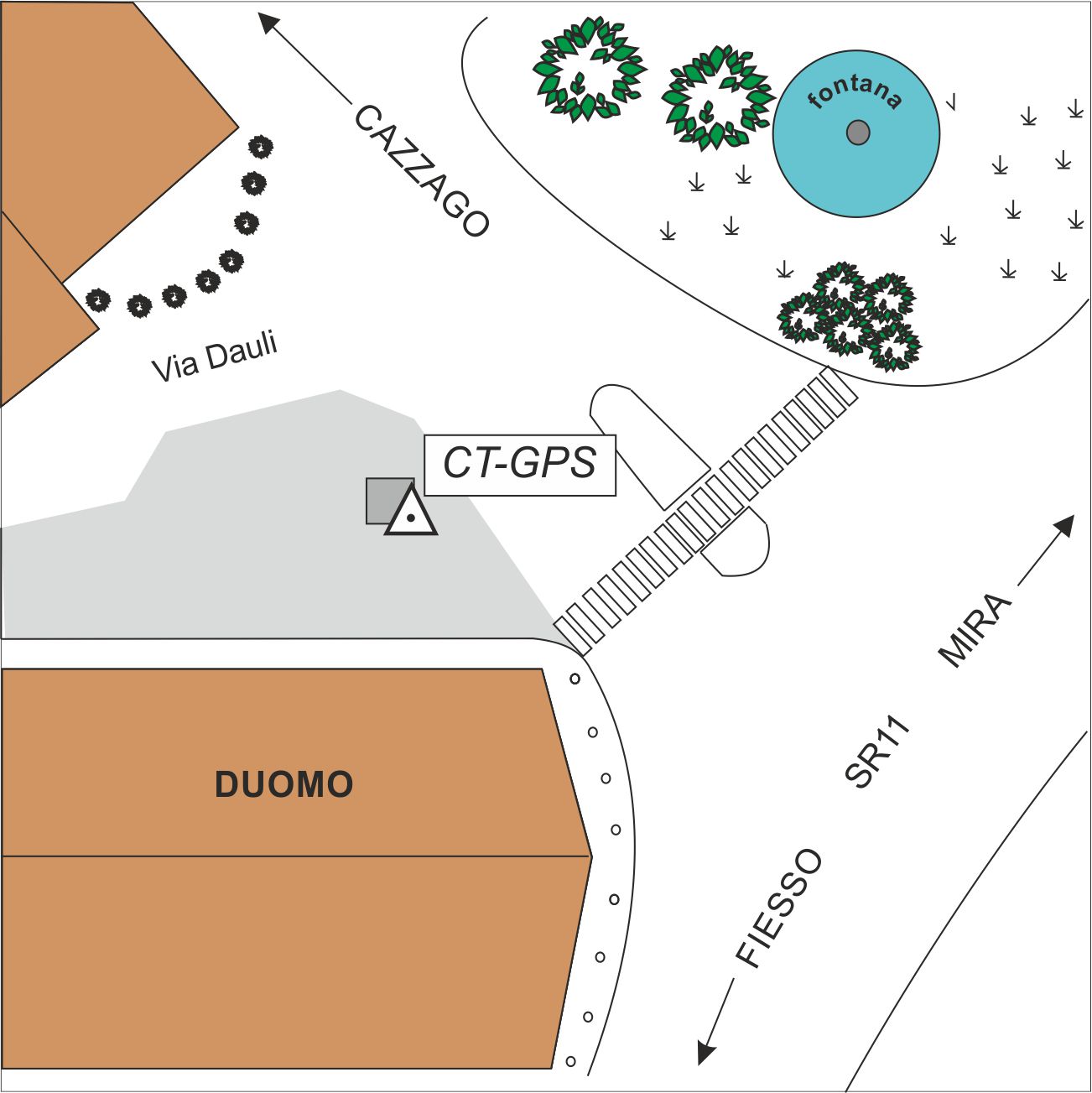 | materializzazione | Centrino in acciaio inox di tipo universale, infisso in corrispondenza dello spigolo SE del tombino posto nella piazzetta sita a Nord del Duomo di San Rocco in Dolo. |