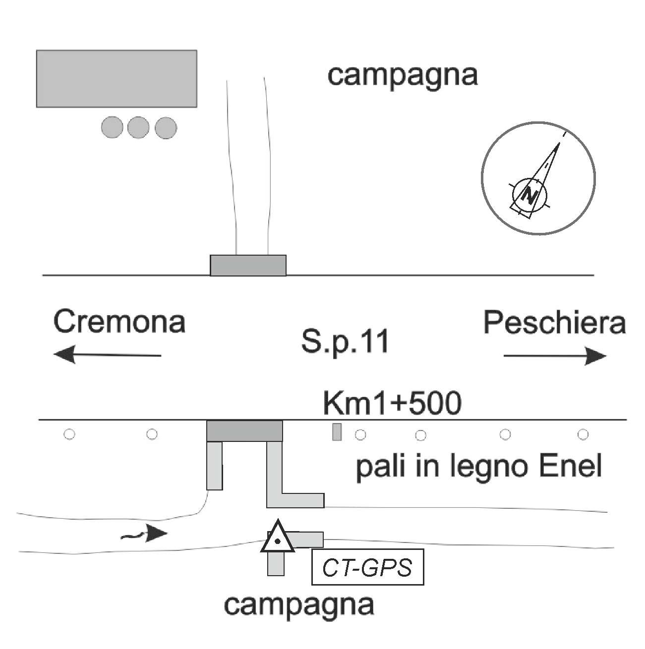| materializzazione | Centrino in acciaio inox del tipo GPS universale, infisso sulla sommità della spalla destra della chiusa del piccolo canale di bonifica, a destra della strada in direzione Peschiera. |
