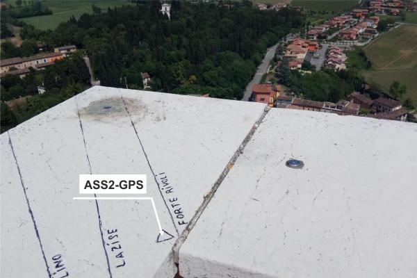 | materializzazione | Asse del triangolo inciso su lastra di marmo del parapetto della Rocca, spigolo Nord. |