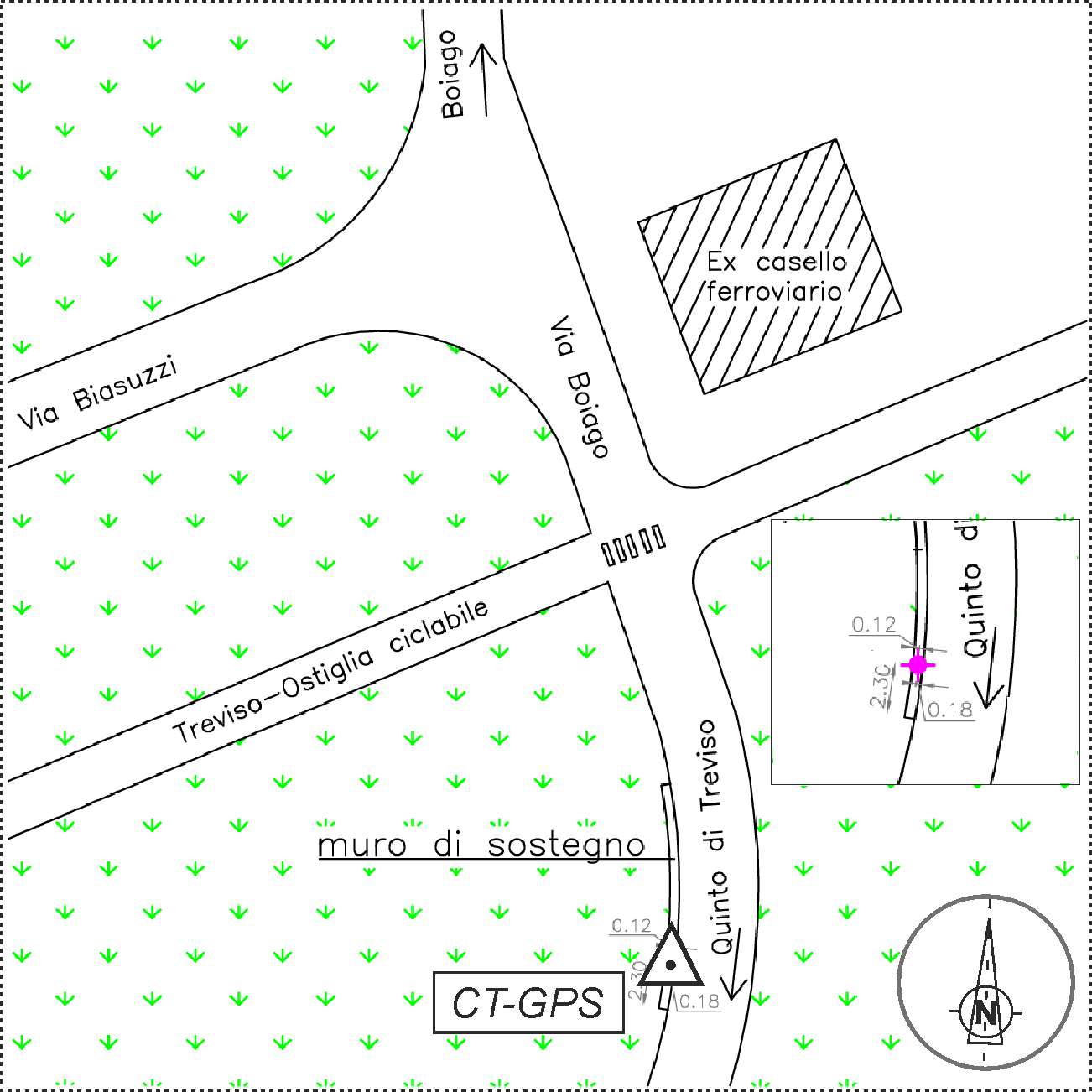 | materializzazione | Chiodo in acciaio inox con borchia a testa piatta della "Rete Geodetica di Treviso", infisso sul cordolo in cemento del basamento del guard rail a 2,30 mt dalla testa, sul lato Ovest di Via Boiago, ed in prossimità della pista ciclabile Treviso-Ostiglia. |