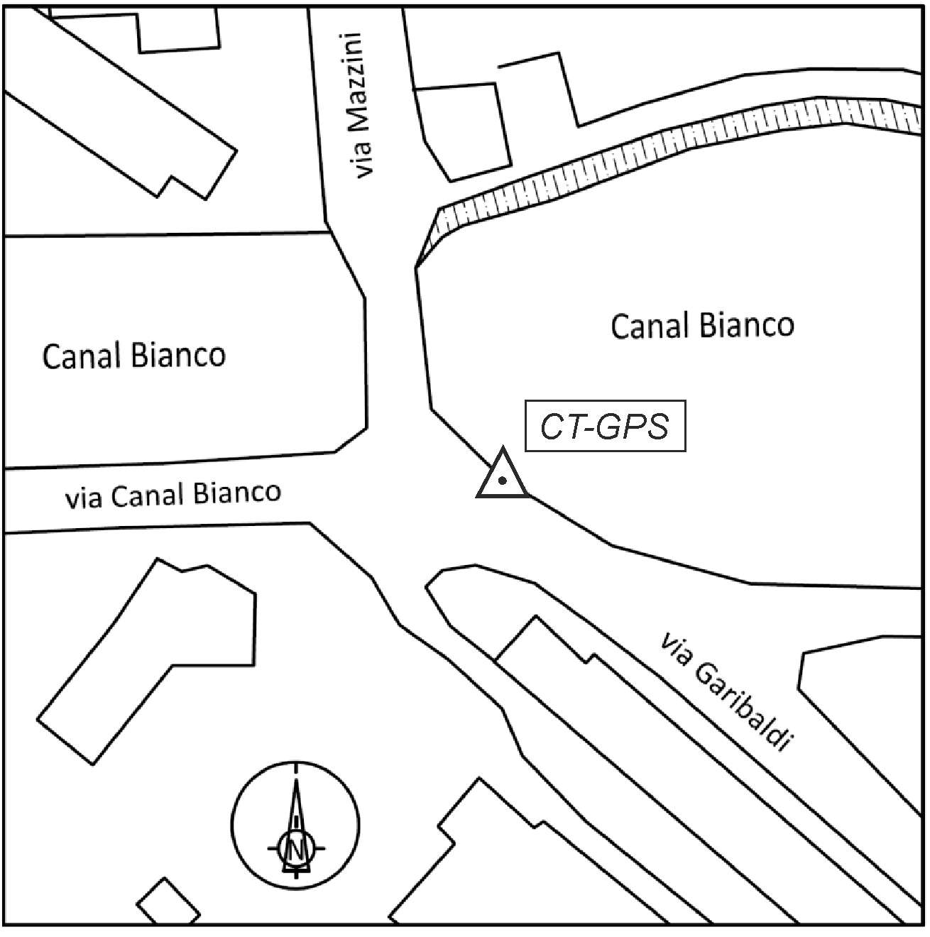 | materializzazione | Centrino in acciaio inox del tipo "universale", infisso sul muro di sostegno in cemento armato dell'argine del Canal Bianco sul lato destro dell'imbocco del ponte in Via Mazzini. |