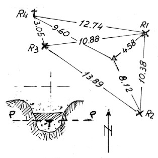 Segnale sulla parte più alta del dosso tondeggiante. Centrini di profondità e di superficie. Riferimenti: 3 croci incise su roccia (R1, R2, R3) ed una grossa croce di legno (R4).x