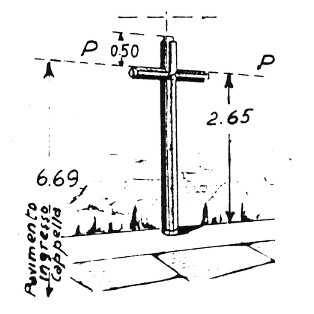 | Materializzazione | Croce centrale e più alta delle tre poste sul tetto a terrazza della cappella, situata sulla sommità del sacrario. Asse geometrico del sacrario. |
