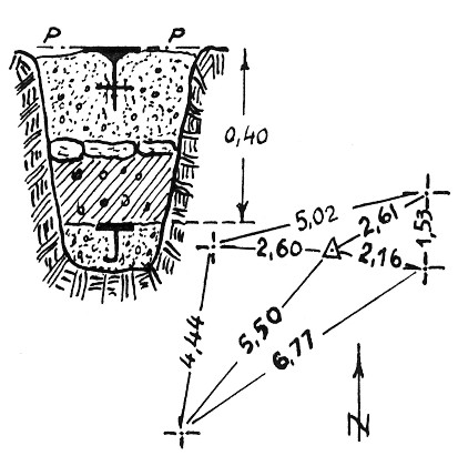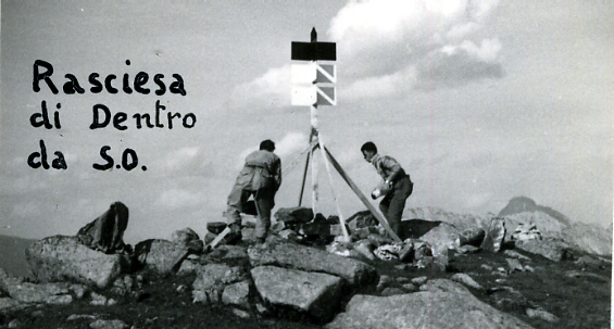 Segnale sulla seconda punta a partire da Ovest della cresta. Centrino di fondo cementato in roccia e sovrastante centrino di superficie in blocchetto di calcestruzzo.