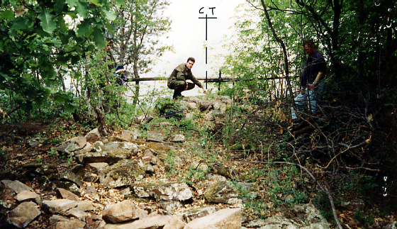 | Materializzazione | Segnale sul punto più alto del colle. Centrino di superficie cementato in una spaccatura della roccia nei pressi dei ruderi dei una casetta. Riferimenti: tre croci incise. Centrino GPS "A" fissato in asse. |