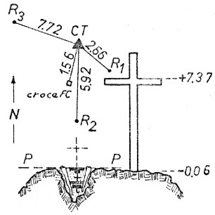 | Materializzazione | Centrini di superficie e di fondo cementati in blocco di calcestruzzo sulla cima rocciosa a S.E. del passo del Muro. Riferimenti: tre centrini metallici (R1, R2, R3) e una croce in legno FC. |