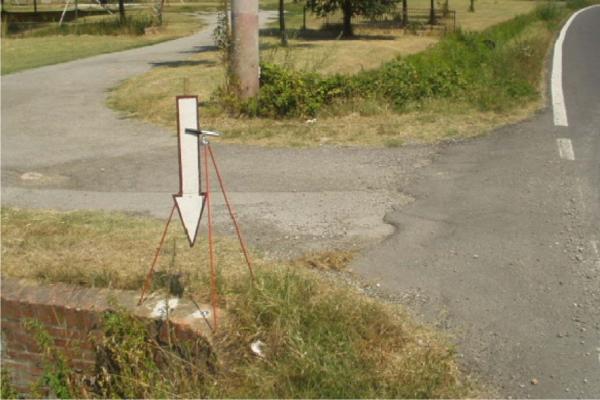 | materializzazione | Centrino metallico infisso sulla spalletta in muratura, la più a sud delle due, all'ingresso della cascina al civico 121 di Via Mavora, nella parte nord di Gaggio. |