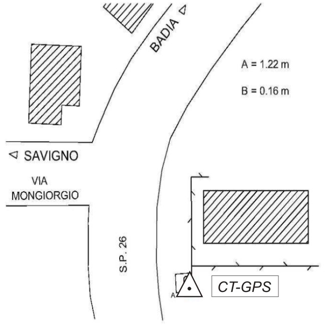 | Materializzazione | Centrino metallico infisso presso lo spigolo sud – est di un grosso manufatto dell'illuminazione pubblica a Badia, al km 18,900 della S.P. 26. |