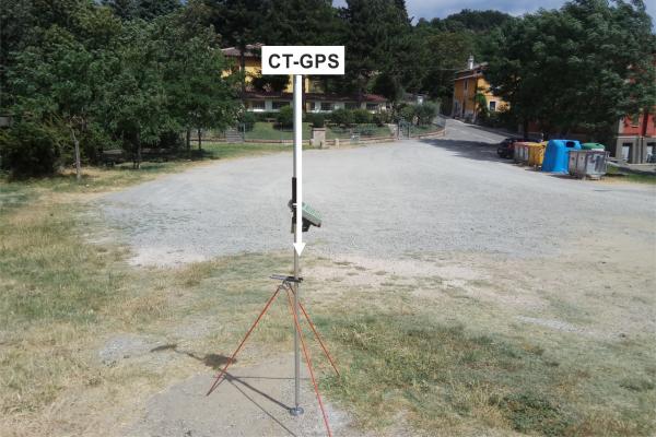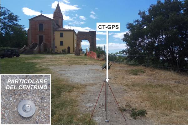 Centrino metallico infisso nel piazzale antistante la chiesa, a terra, su roccia affioramento in gesso. Il punto si trova sulla sinistra osservando la chiesa.
